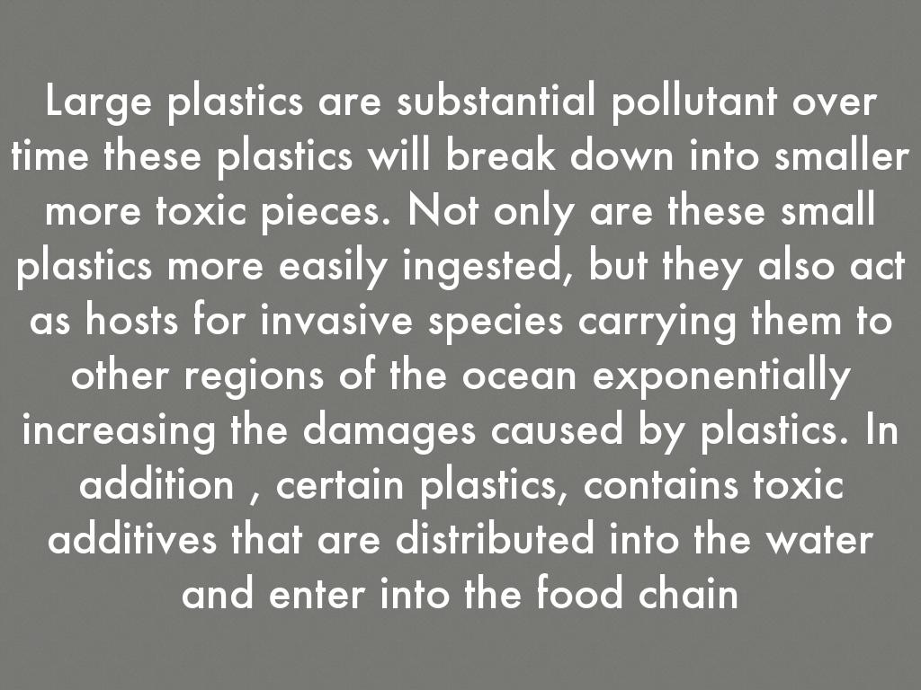 Large plastics are substantial pollutant over time these plastics will break down into smaller more toxic pieces. Not only are these small plastics more easily ingested, but they also act as hosts for invasive species carrying them to other regions of the ocean exponentially increasing the damages caused by plastics. In addition , certain plastics, contains toxic additives that are distributed into the water and enter into the food chain