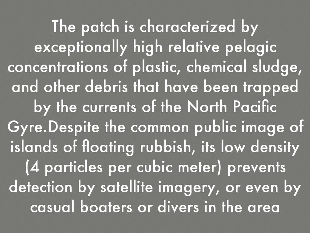 The patch is characterized by exceptionally high relative pelagic concentrations of plastic, chemical sludge, and other debris that have been trapped by the currents of the North Pacific Gyre.Despite the common public image of islands of floating rubbish, its low density (4 particles per cubic meter) prevents detection by satellite imagery, or even by casual boaters or divers in the area