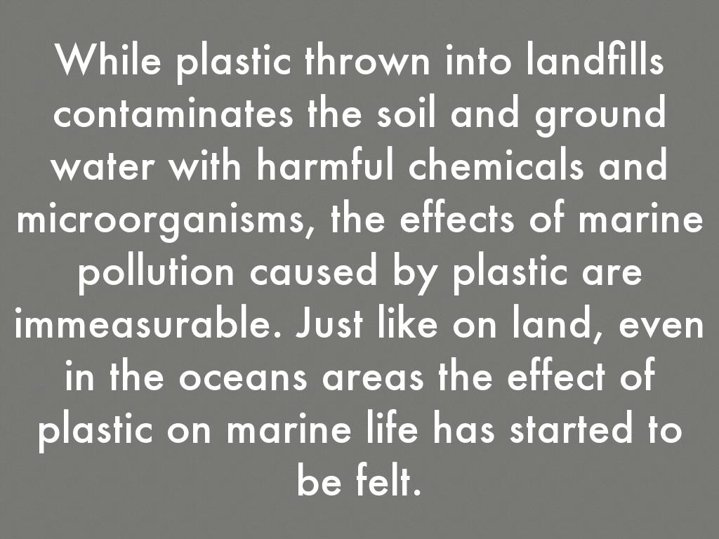 While plastic thrown into landfills contaminates the soil and ground water with harmful chemicals and microorganisms, the effects of marine pollution caused by plastic are immeasurable. Just like on land, even in the oceans areas the effect of plastic on marine life has started to be felt.