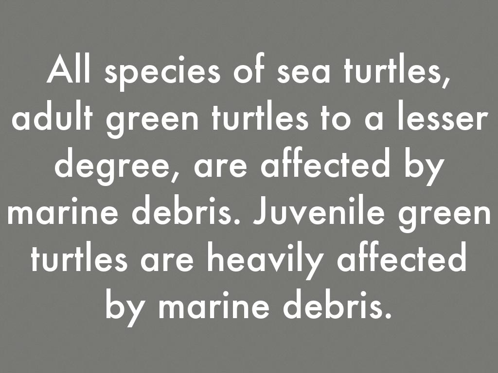 All species of sea turtles, adult green turtles to a lesser degree, are affected by marine debris. Juvenile green turtles are heavily affected by marine debris.