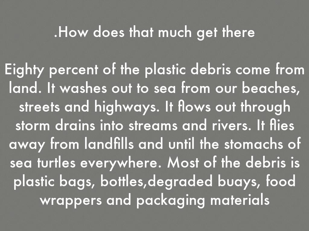 Eighty percent of the plastic debris come from land. It washes out to sea from our beaches, streets and highways. It flows out through storm drains into streams and rivers. It flies away from landfills and until the stomachs of sea turtles everywhere. Most of the debris is plastic bags, bottles,degraded buays, food wrappers and packaging materials