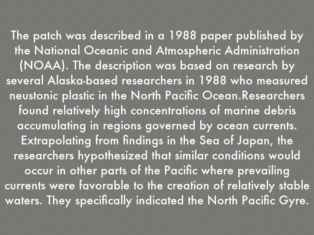 The patch was described in a 1988 paper published by the National Oceanic and Atmospheric Administration (NOAA). The description was based on research by several Alaska-based researchers in 1988 who measured neustonic plastic in the North Pacific Ocean.Researchers found relatively high concentrations of marine debris accumulating in regions governed by ocean currents. Extrapolating from findings in the Sea of Japan, the researchers hypothesized that similar conditions would occur in other parts of the Pacific where prevailing currents were favorable to the creation of relatively stable waters. They specifically indicated the North Pacific Gyre.