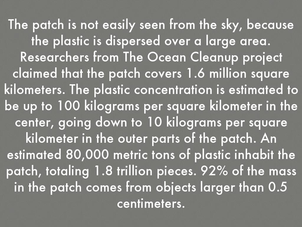 The patch is not easily seen from the sky, because the plastic is dispersed over a large area. Researchers from The Ocean Cleanup project claimed that the patch covers 1.6 million square kilometers. The plastic concentration is estimated to be up to 100 kilograms per square kilometer in the center, going down to 10 kilograms per square kilometer in the outer parts of the patch. An estimated 80,000 metric tons of plastic inhabit the patch, totaling 1.8 trillion pieces. 92% of the mass in the patch comes from objects larger than 0.5 centimeters.