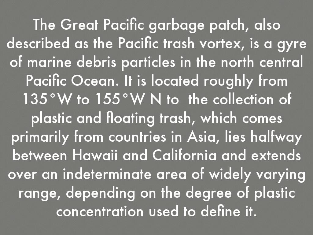 The Great Pacific garbage patch, also described as the Pacific trash vortex, is a gyre of marine debris particles in the north central Pacific Ocean. It is located roughly from 135°W to 155°W N to the collection of plastic and floating trash, which comes primarily from countries in Asia, lies halfway between Hawaii and California and extends over an indeterminate area of widely varying range, depending on the degree of plastic concentration used to define it.
