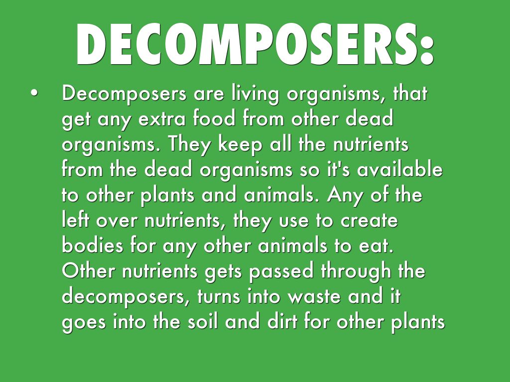 Decomposers are living organisms, that get any extra food from other dead organisms. They keep all the nutrients from the dead organisms so it's available to other plants and animals. Any of the left over nutrients, they use to create bodies for any other animals to eat. Other nutrients gets passed through the decomposers, turns into waste and it goes into the soil and dirt for other plants and animals to take in.