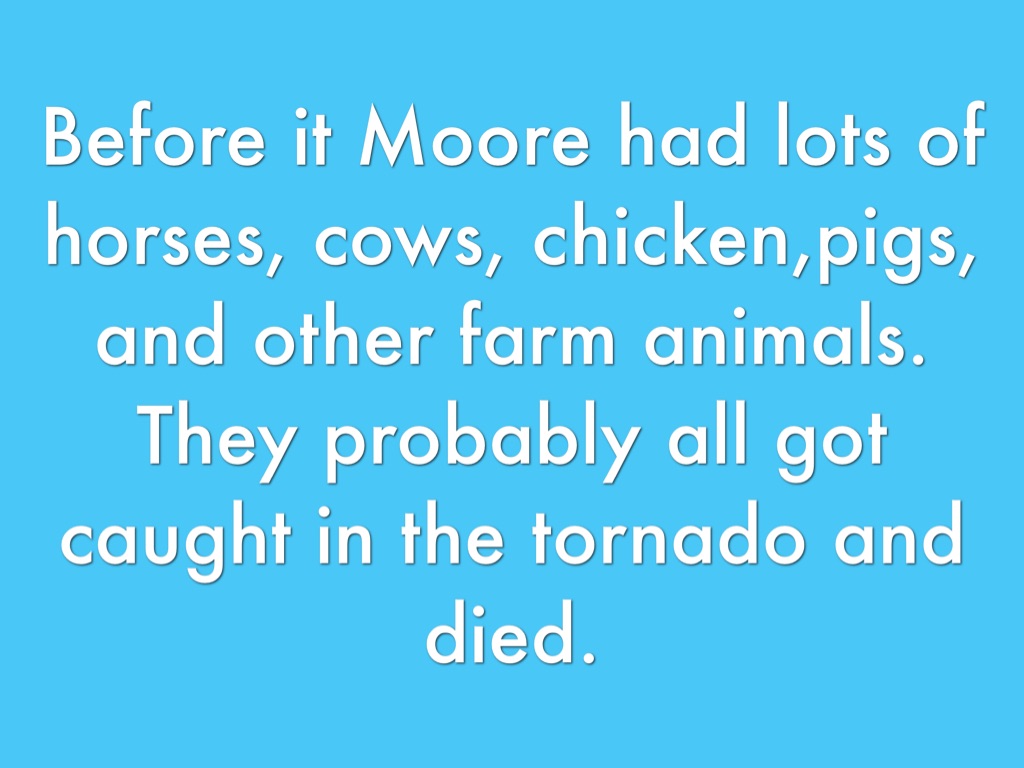 Before it Moore had lots of horses, cows, chicken,pigs, and other farm animals. They probably all got caught in the tornado and died.
