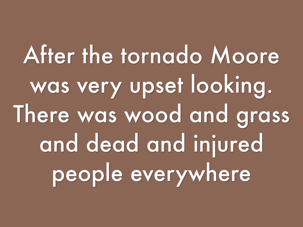 After the tornado Moore was very upset looking. There was wood and grass and dead and injured people everywhere