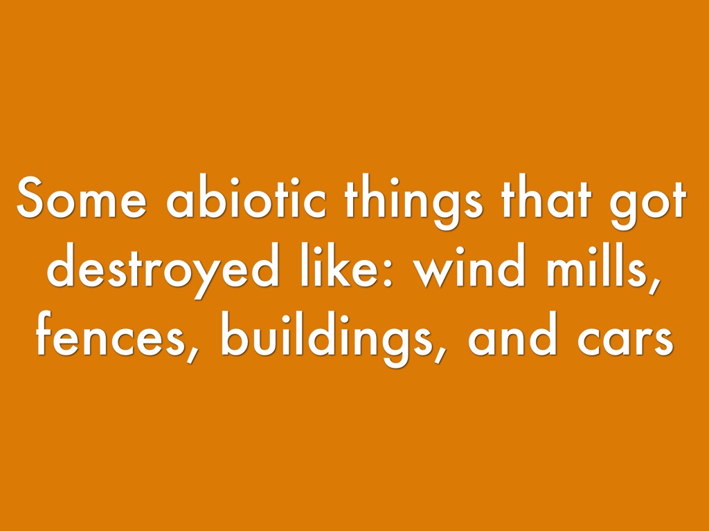 Some abiotic things that got destroyed like: wind mills, fences, buildings, and cars