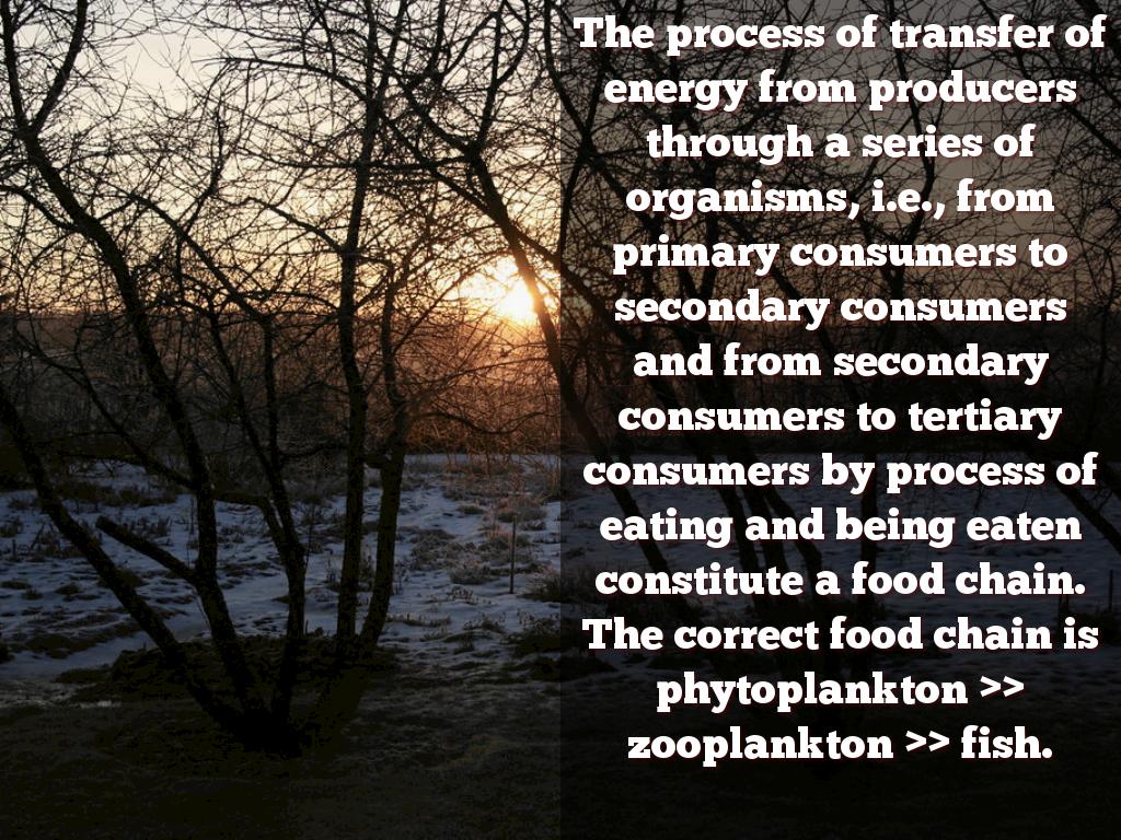 The process of transfer of energy from producers through a series of organisms, i.e., from primary consumers to secondary consumers and from secondary consumers to tertiary consumers by process of eating and being eaten constitute a food chain. The correct food chain is phytoplankton >> zooplankton >> fish.
