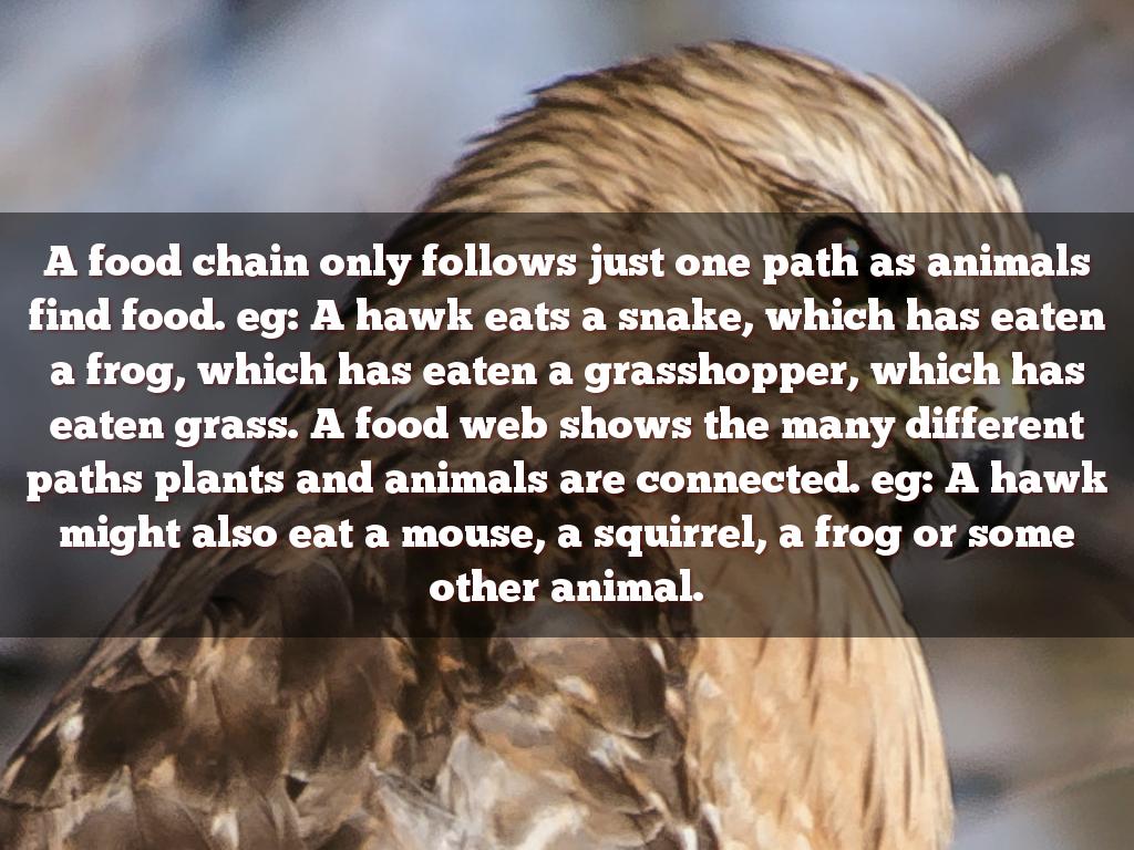 A food chain only follows just one path as animals find food. eg: A hawk eats a snake, which has eaten a frog, which has eaten a grasshopper, which has eaten grass. A food web shows the many different paths plants and animals are connected. eg: A hawk might also eat a mouse, a squirrel, a frog or some other animal.