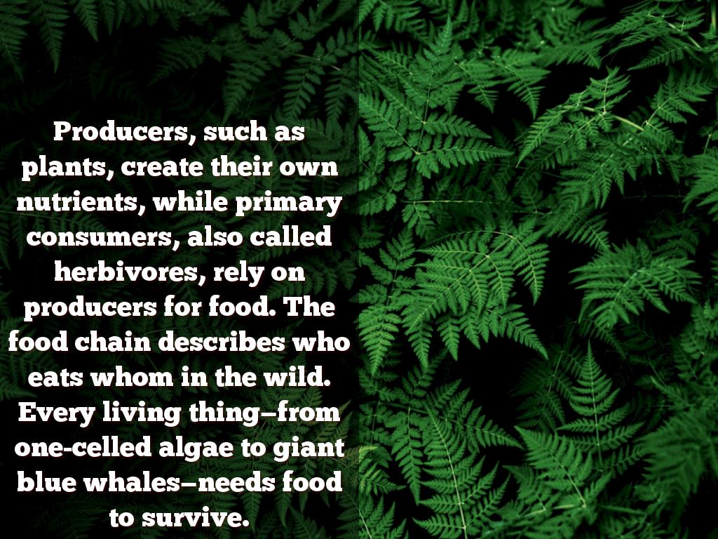 Producers, such as plants, create their own nutrients, while primary consumers, also called herbivores, rely on producers for food. The food chain describes who eats whom in the wild. Every living thing—from one-celled algae to giant blue whales—needs food to survive.