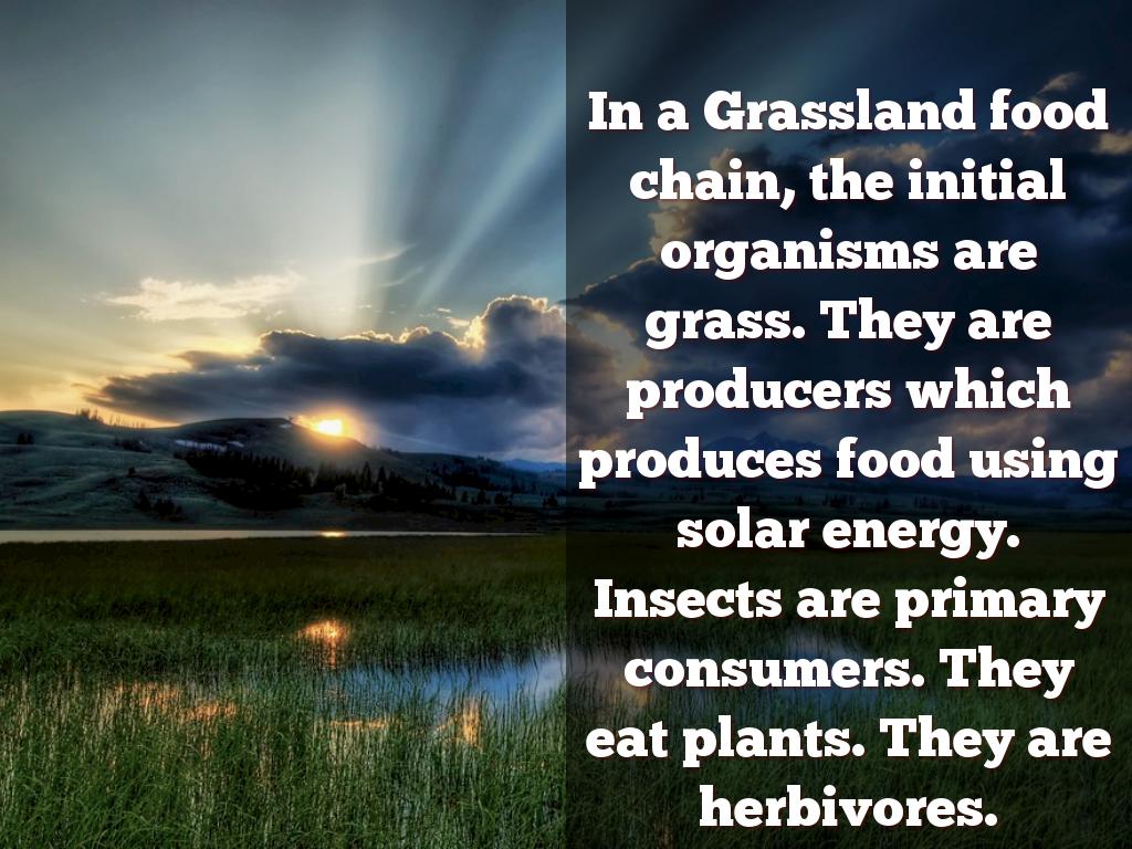 In a Grassland food chain, the initial organisms are grass. They are producers which produces food using solar energy. Insects are primary consumers. They eat plants. They are herbivores.