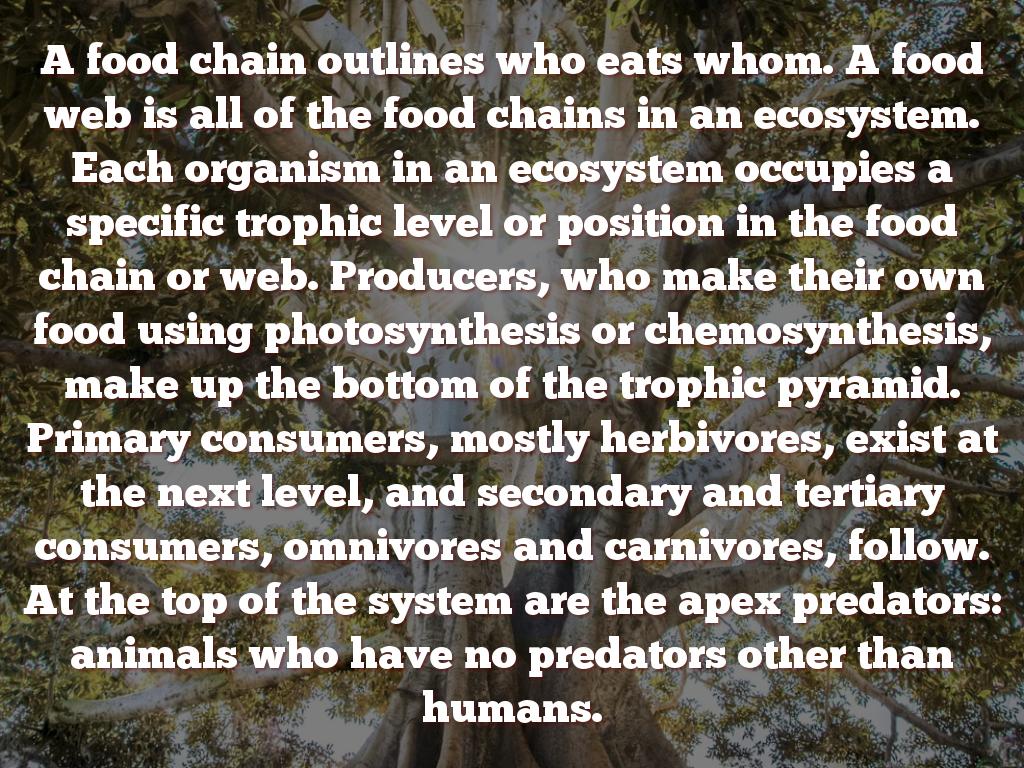 A food chain outlines who eats whom. A food web is all of the food chains in an ecosystem. Each organism in an ecosystem occupies a specific trophic level or position in the food chain or web. Producers, who make their own food using photosynthesis or chemosynthesis, make up the bottom of the trophic pyramid. Primary consumers, mostly herbivores, exist at the next level, and secondary and tertiary consumers, omnivores and carnivores, follow. At the top of the system are the apex predators: animals who have no predators other than humans.
