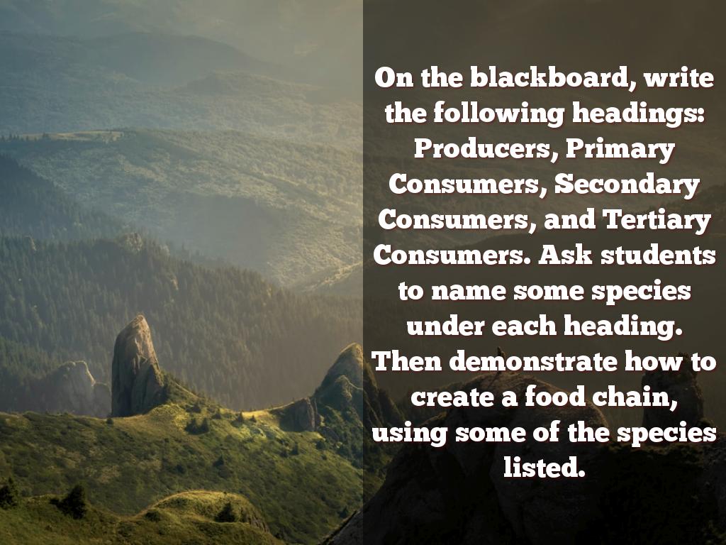 On the blackboard, write the following headings: Producers, Primary Consumers, Secondary Consumers, and Tertiary Consumers. Ask students to name some species under each heading. Then demonstrate how to create a food chain, using some of the species listed.
