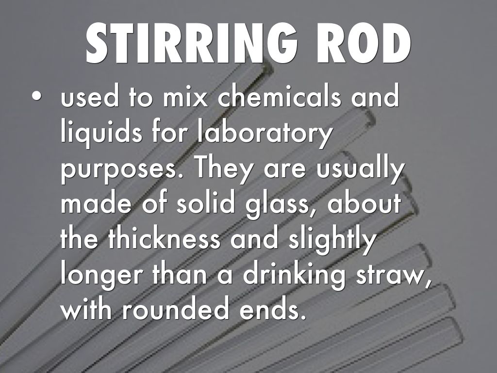 used to mix chemicals and liquids for laboratory purposes. They are usually made of solid glass, about the thickness and slightly longer than a drinking straw, with rounded ends.