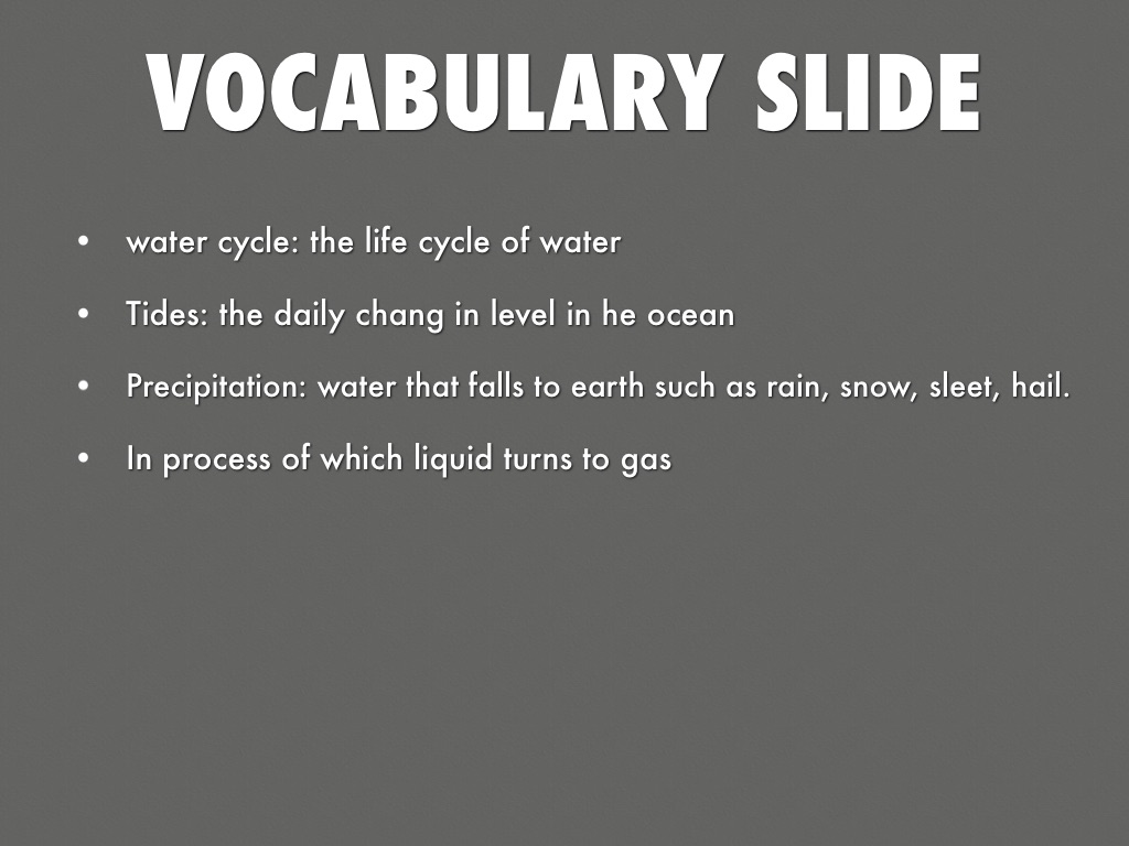 Precipitation: water that falls to earth such as rain, snow, sleet, hail.