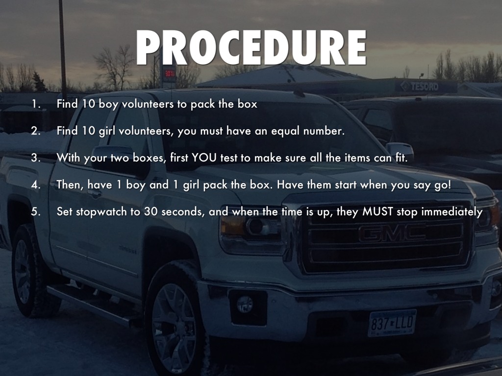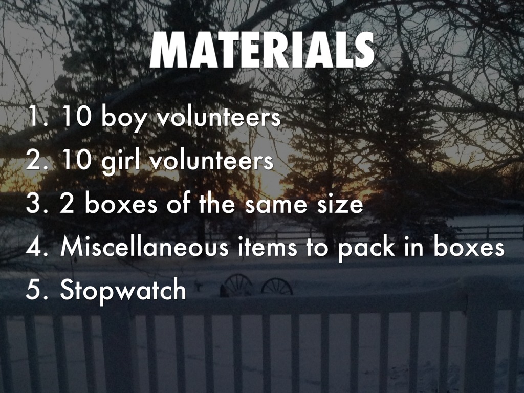 Then, have 1 boy and 1 girl pack the box. Have them start when you say go!