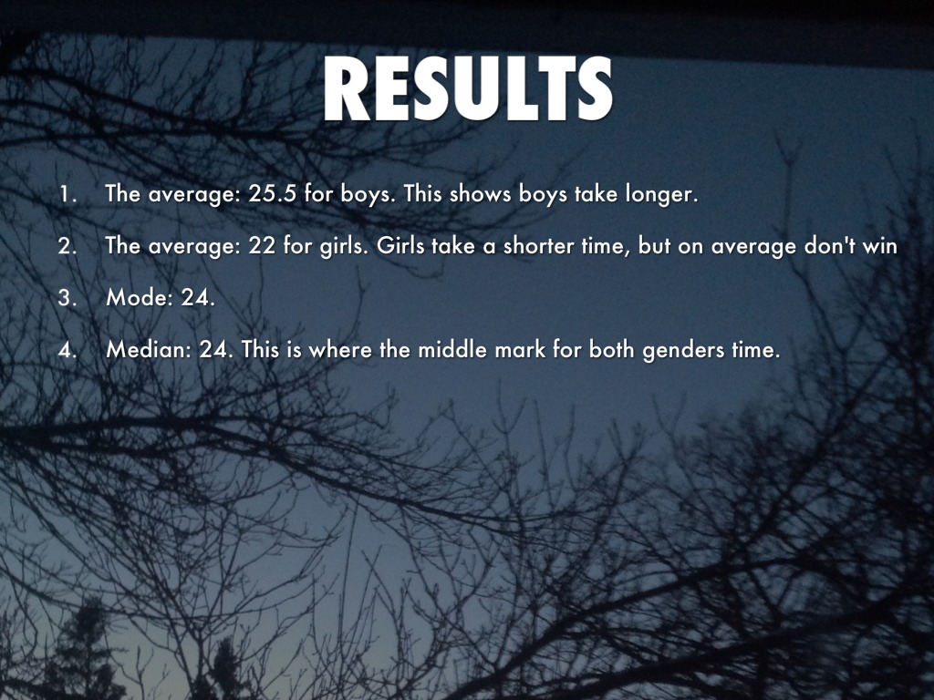 The average: 22 for girls. Girls take a shorter time, but on average don't win