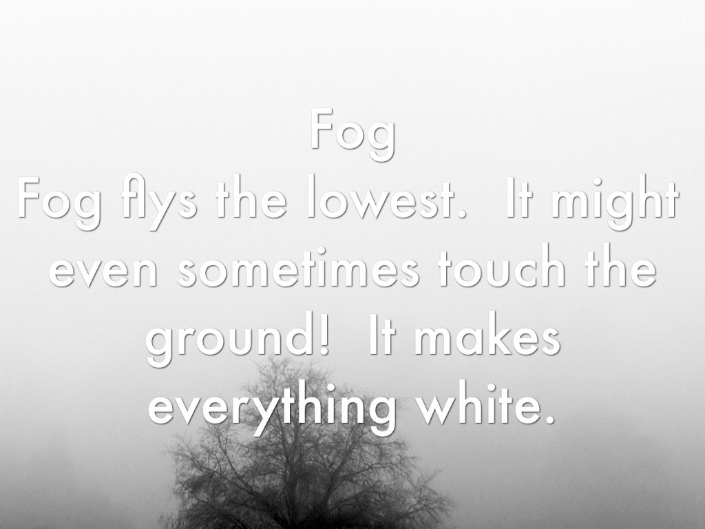 Fog flys the lowest. It might even sometimes touch the ground! It makes everything white.