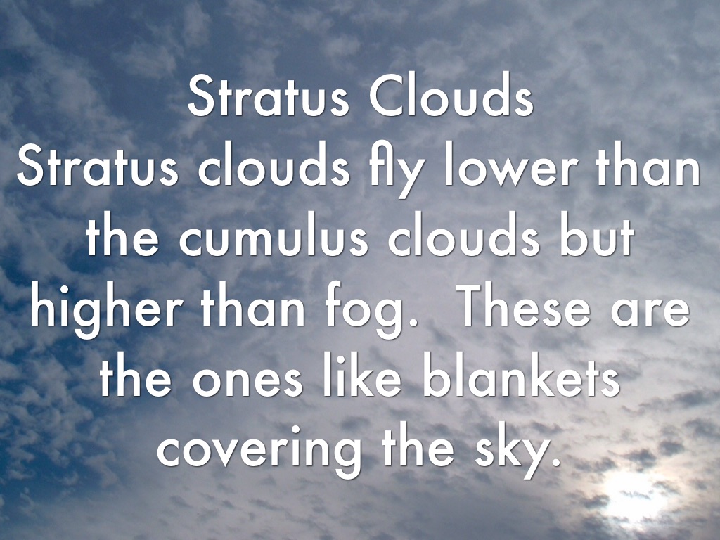Stratus clouds fly lower than the cumulus clouds but higher than fog. These are the ones like blankets covering the sky.