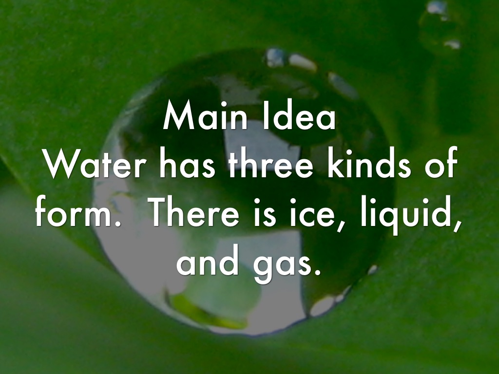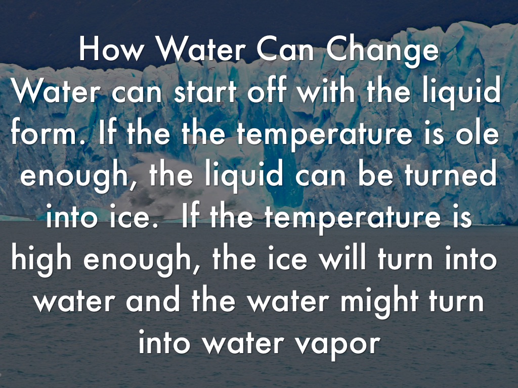Water can start off with the liquid form. If the the temperature is ole enough, the liquid can be turned into ice. If the temperature is high enough, the ice will turn into water and the water might turn into water vapor