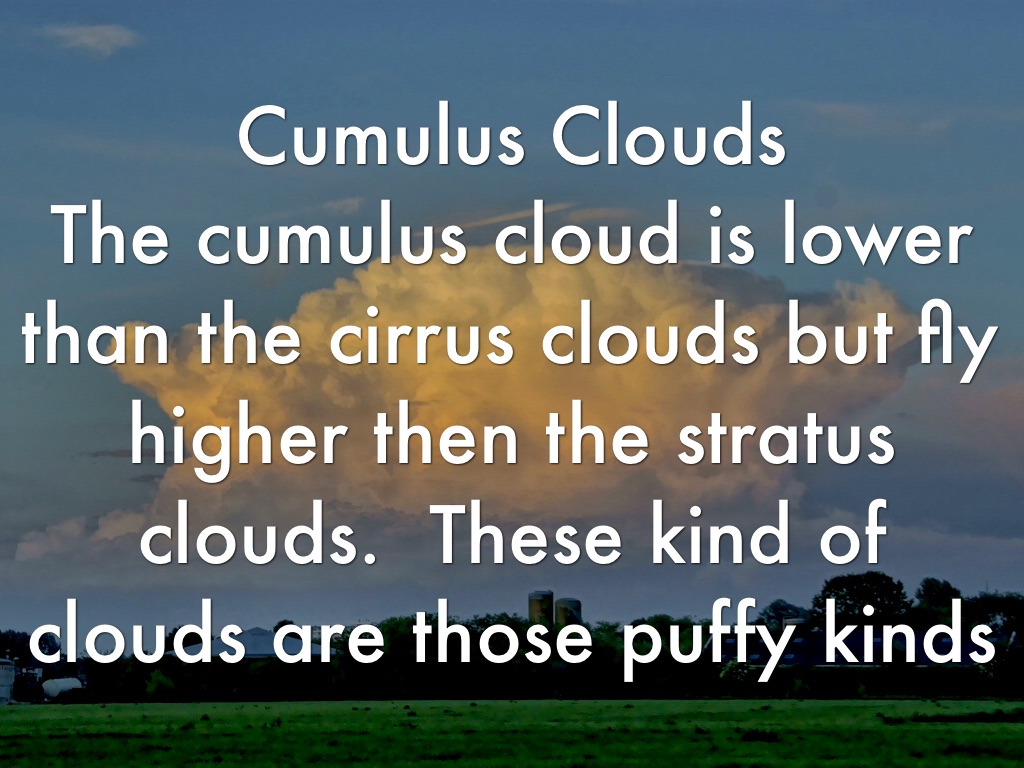 The cumulus cloud is lower than the cirrus clouds but fly higher then the stratus clouds. These kind of clouds are those puffy kinds