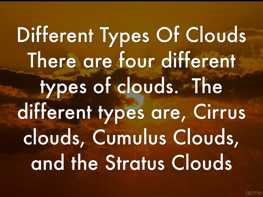 There are four different types of clouds. The different types are, Cirrus clouds, Cumulus Clouds, and the Stratus Clouds