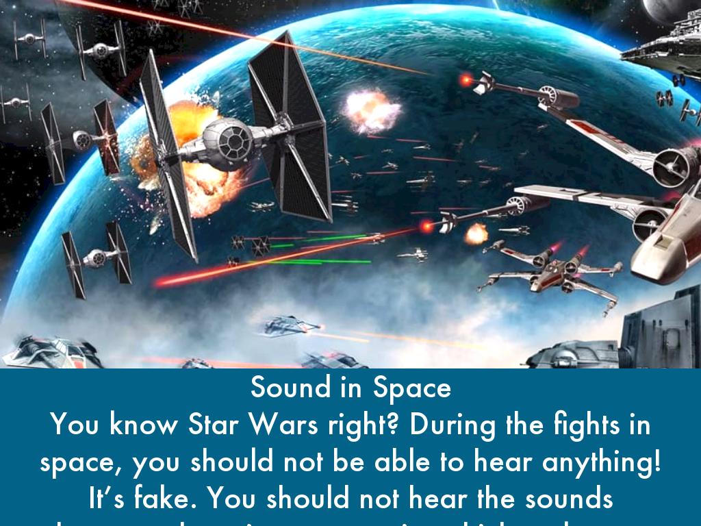 You know Star Wars right? During the fights in space, you should not be able to hear anything! It’s fake. You should not hear the sounds because there is zero gravity which makes no vibration.