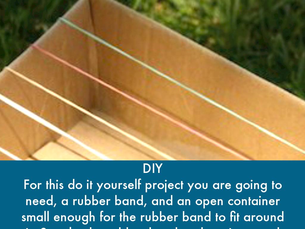 For this do it yourself project you are going to need, a rubber band, and an open container small enough for the rubber band to fit around it. So take the rubber band and put it around the container so that the band is hanging off the top. Now pluck the string see what happens!
