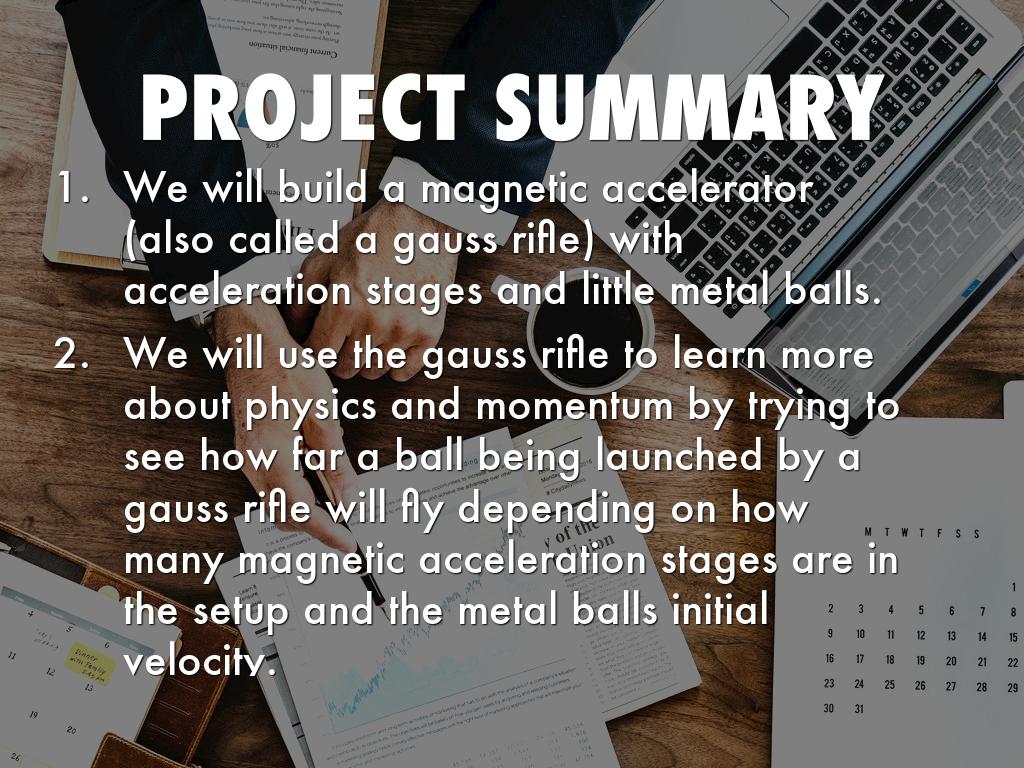 We will use the gauss rifle to learn more about physics and momentum by trying to see how far a ball being launched by a gauss rifle will fly depending on how many magnetic acceleration stages are in the setup and the metal balls initial velocity.