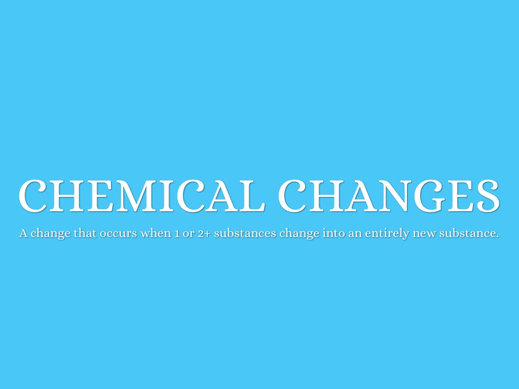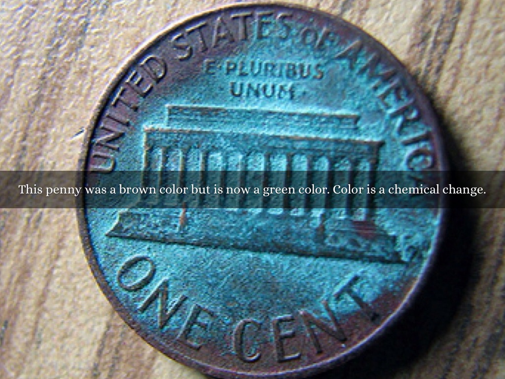 This penny was a brown color but is now a green color. Color is a chemical change.