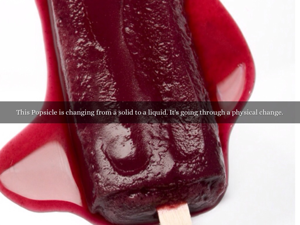 This Popsicle is changing from a solid to a liquid. It's going through a physical change.