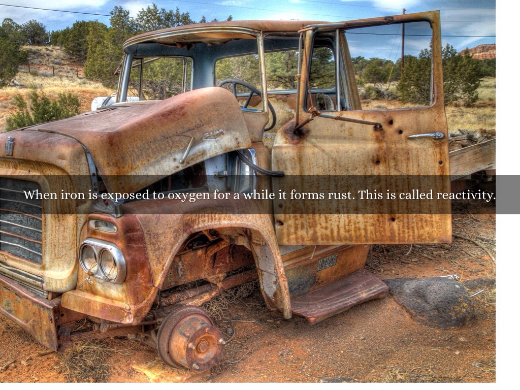 When iron is exposed to oxygen for a while it forms rust. This is called reactivity.