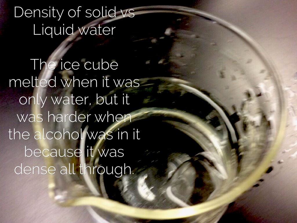 The ice cube melted when it was only water, but it was harder when the alcohol was in it because it was dense all through.