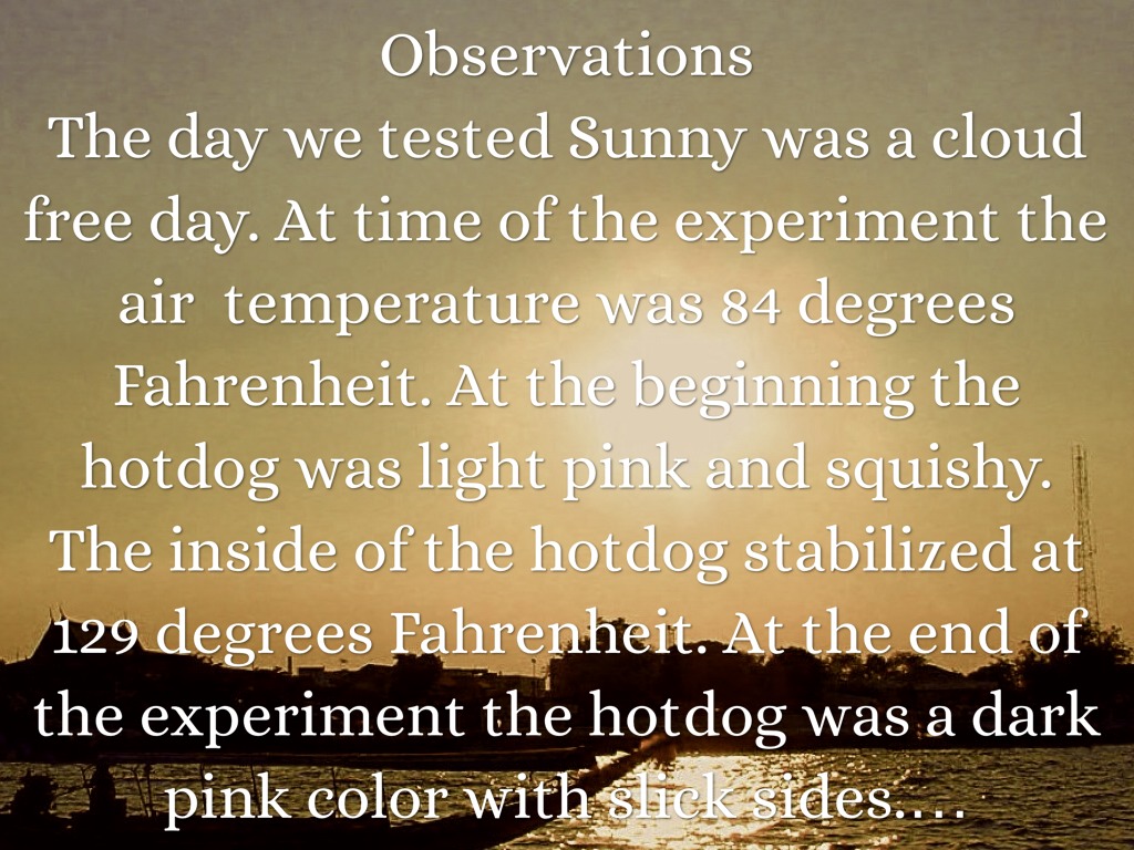 The day we tested Sunny was a cloud free day. At time of the experiment the air temperature was 84 degrees Fahrenheit. At the beginning the hotdog was light pink and squishy. The inside of the hotdog stabilized at 129 degrees Fahrenheit. At the end of the experiment the hotdog was a dark pink color with slick sides.