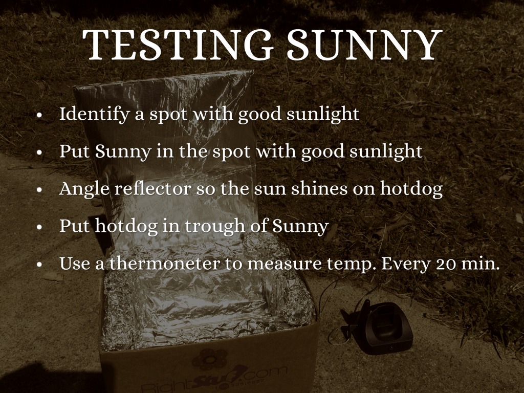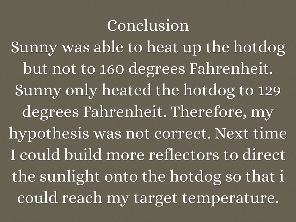 Sunny was able to heat up the hotdog but not to 160 degrees Fahrenheit. Sunny only heated the hotdog to 129 degrees Fahrenheit. Therefore, my hypothesis was not correct. Next time I could build more reflectors to direct the sunlight onto the hotdog so that i could reach my target temperature.