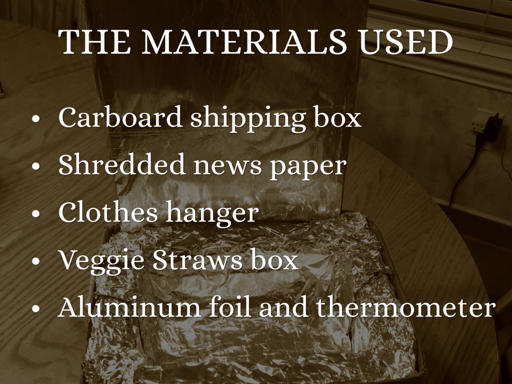 My hypotheses is that if I place my solar cooker with my hot dog in it in direct sunlight for 2 hours the inside of the hotdog will heat up to at least 160 degrees fahrenheit.