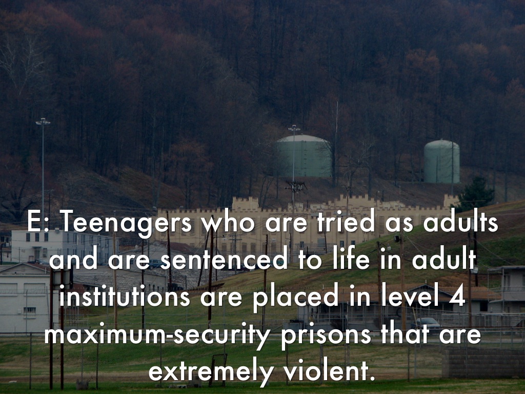 E: Teenagers who are tried as adults and are sentenced to life in adult institutions are placed in level 4 maximum-security prisons that are extremely violent.