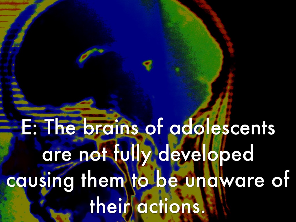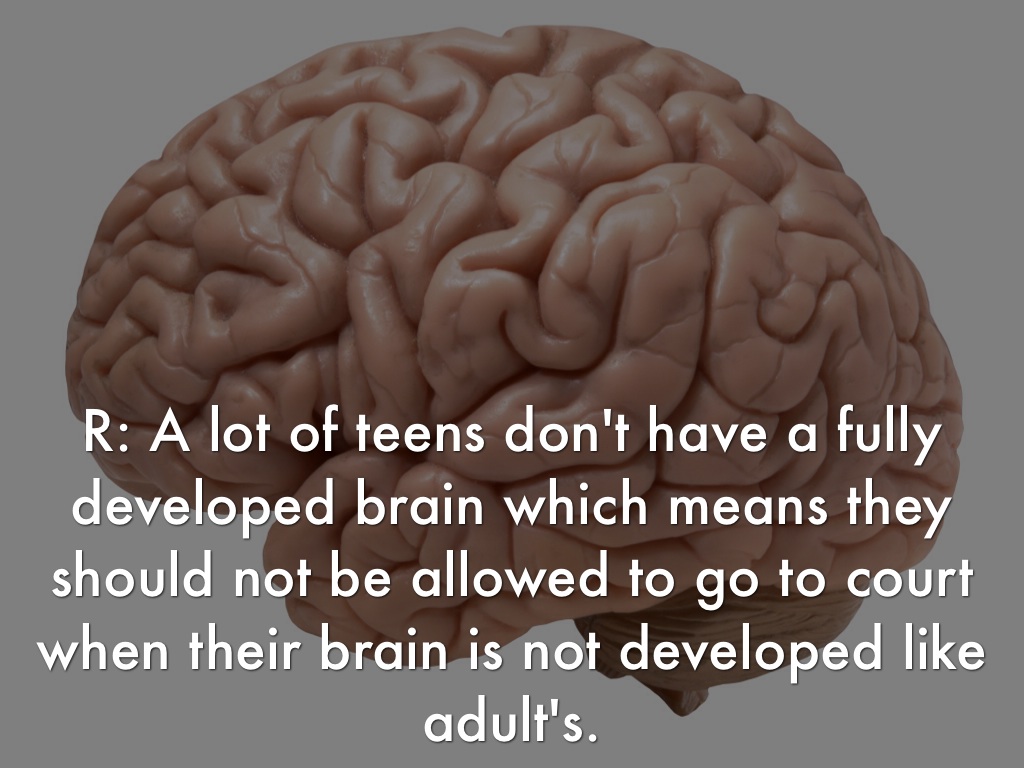 R: A lot of teens don't have a fully developed brain which means they should not be allowed to go to court when their brain is not developed like adult's.