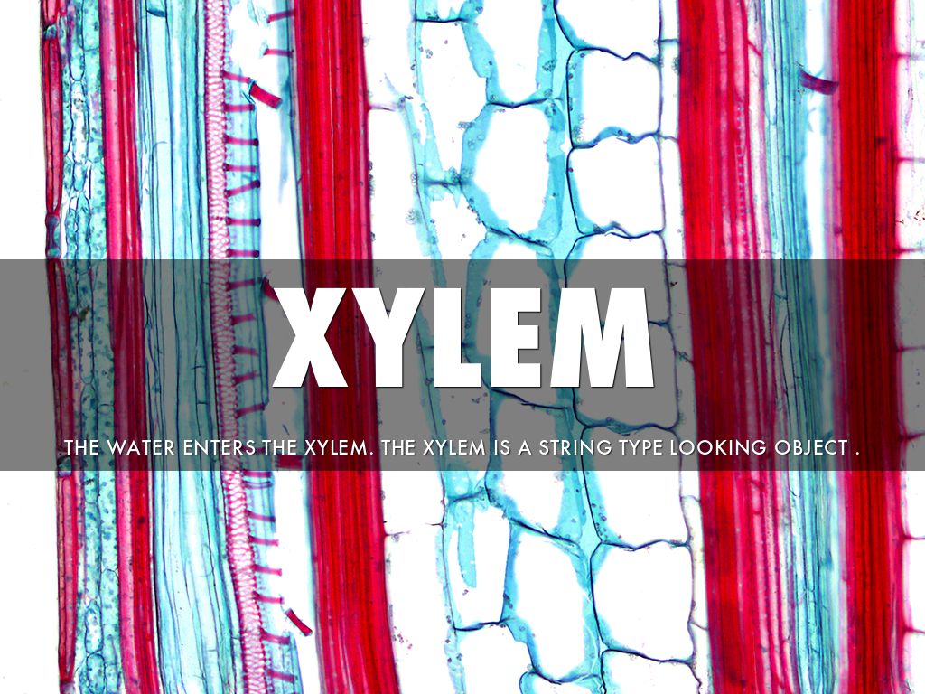 THE WATER ENTERS THE XYLEM. THE XYLEM IS A STRING TYPE LOOKING OBJECT .