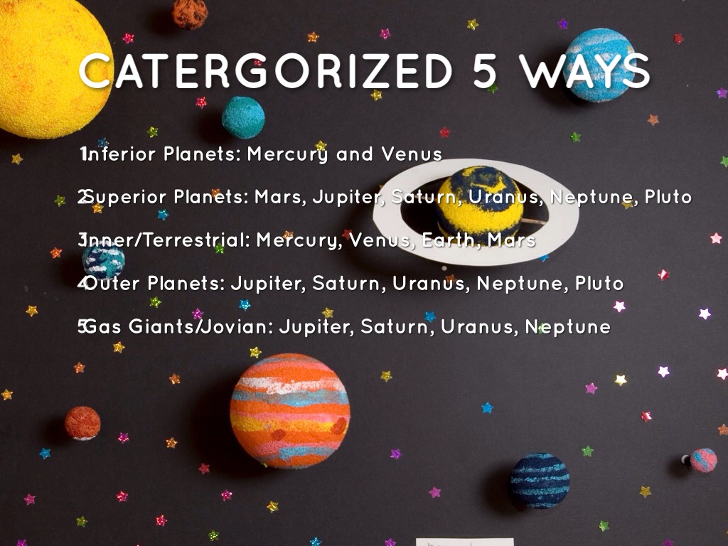Inner/Terrestrial: Mercury, Venus, Earth, Mars