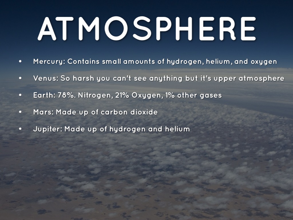Earth: 78%. Nitrogen, 21% Oxygen, 1% other gases