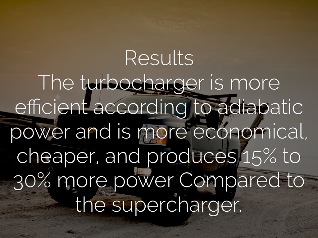 Results The turbocharger is more efficient according to adiabatic power and is more economical, cheaper, and produces 15% to 30% more power Compared to the supercharger.