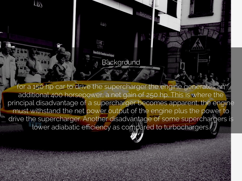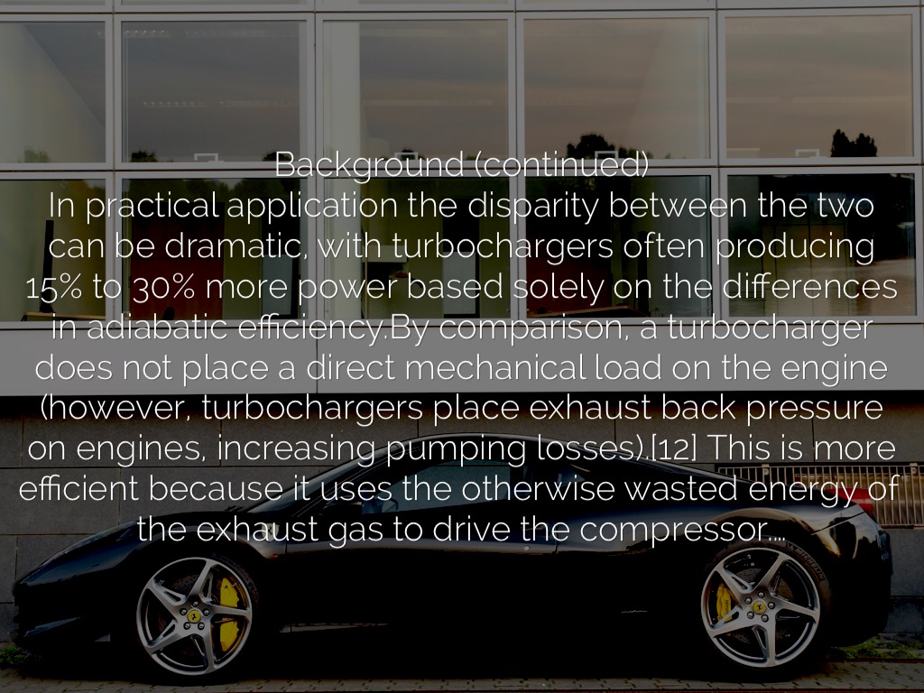 Background (continued) In practical application the disparity between the two can be dramatic, with turbochargers often producing 15% to 30% more power based solely on the differences in adiabatic efficiency.By comparison, a turbocharger does not place a direct mechanical load on the engine (however, turbochargers place exhaust back pressure on engines, increasing pumping losses).[12] This is more efficient because it uses the otherwise wasted energy of the exhaust gas to drive the compressor.