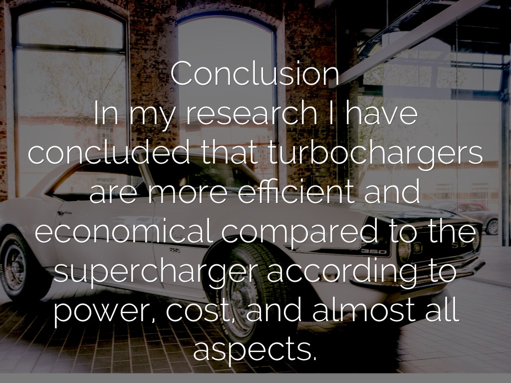 Conclusion In my research I have concluded that turbochargers are more efficient and economical compared to the supercharger according to power, cost, and almost all aspects.