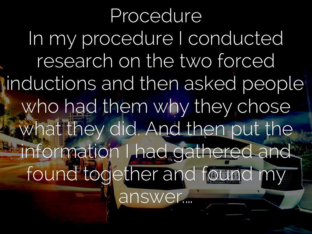 Procedure In my procedure I conducted research on the two forced inductions and then asked people who had them why they chose what they did. And then put the information I had gathered and found together and found my answer.