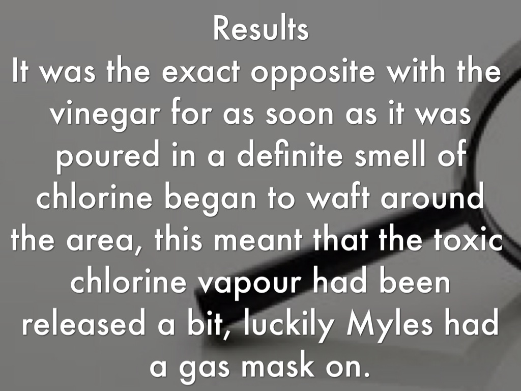 It was the exact opposite with the vinegar for as soon as it was poured in a definite smell of chlorine began to waft around the area, this meant that the toxic chlorine vapour had been released a bit, luckily Myles had a gas mask on.