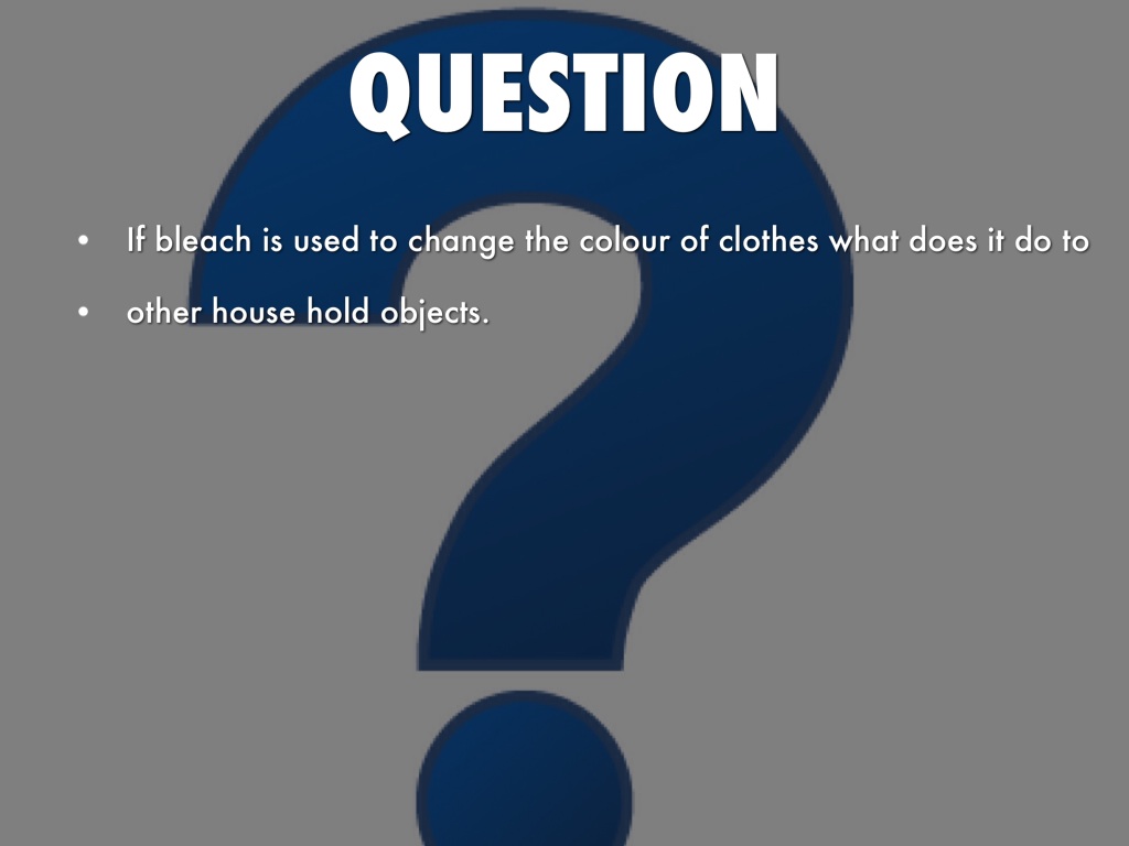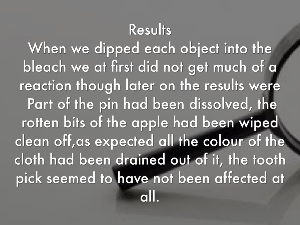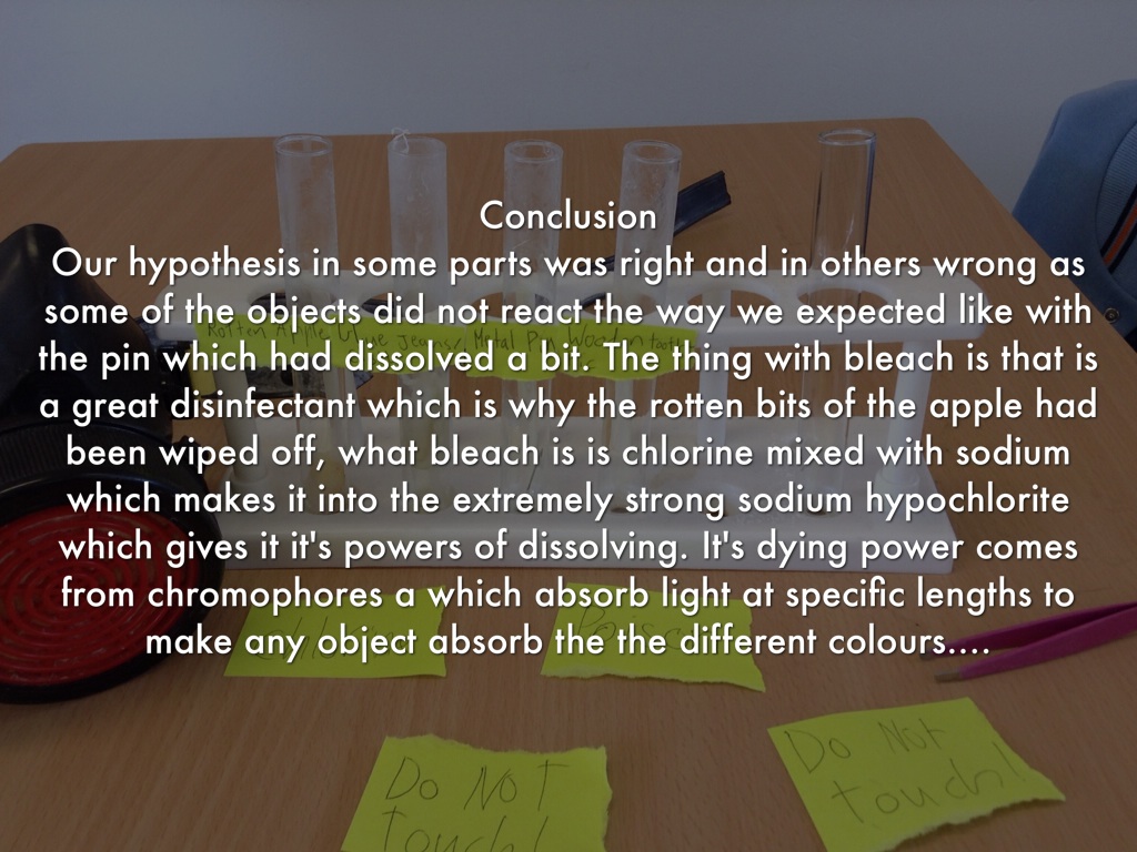 Our hypothesis in some parts was right and in others wrong as some of the objects did not react the way we expected like with the pin which had dissolved a bit. The thing with bleach is that is a great disinfectant which is why the rotten bits of the apple had been wiped off, what bleach is is chlorine mixed with sodium which makes it into the extremely strong sodium hypochlorite which gives it it's powers of dissolving. It's dying power comes from chromophores a which absorb light at specific lengths to make any object absorb the the different colours.
