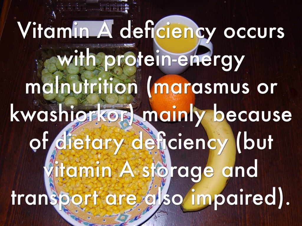 Vitamin A deficiency occurs with protein-energy malnutrition (marasmus or kwashiorkor) mainly because of dietary deficiency (but vitamin A storage and transport are also impaired).