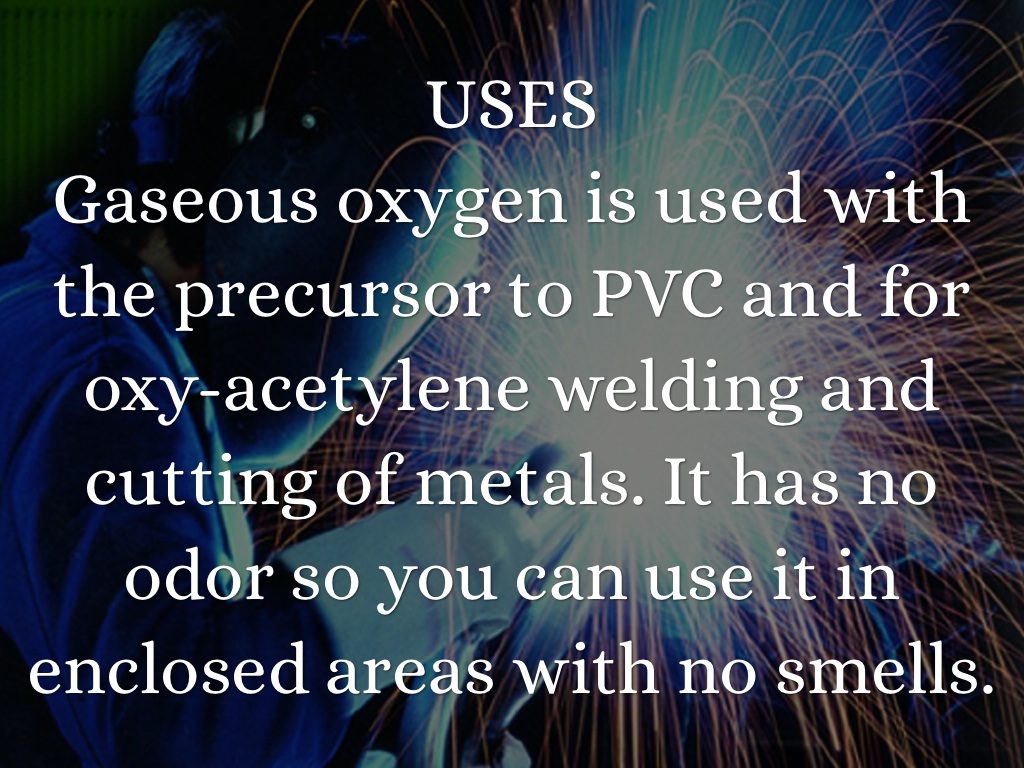 Gaseous oxygen is used with the precursor to PVC and for oxy-acetylene welding and cutting of metals. It has no odor so you can use it in enclosed areas with no smells.